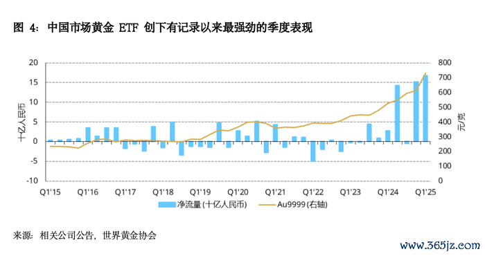 《报告》显示,尽管1月有小幅流出,但2月和3月的大幅流入将国内一季度黄金ETF总需求推升至167亿元,总持仓增加23吨。创纪录的季度表现,推动中国市场黄金ETF的资产管理总规模和总持仓分别达到1010亿元和138吨的历史新高。
