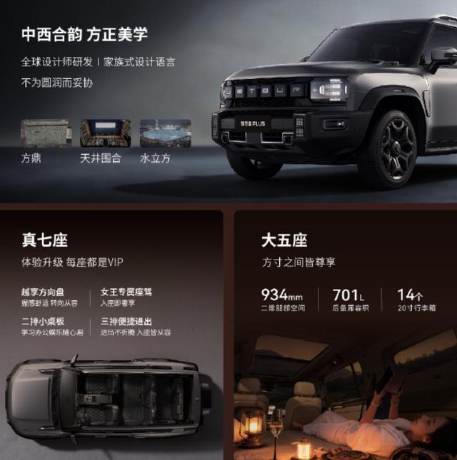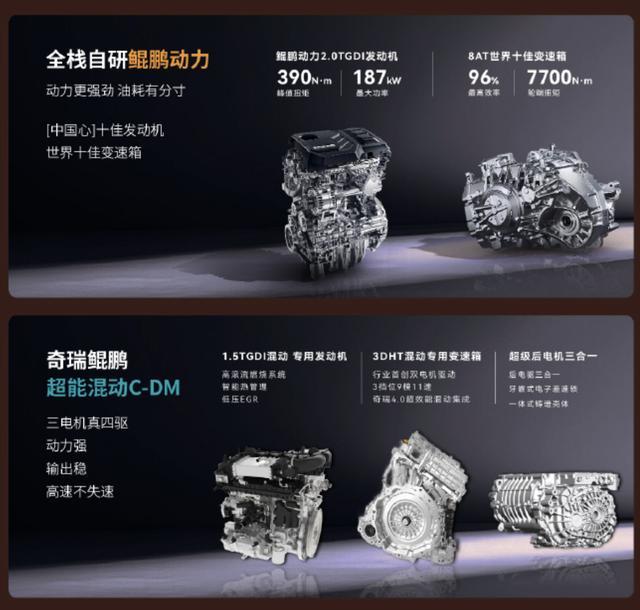 而捷途旅行者 PLUS C-DM 搭载奇瑞鲲鹏 C-DM 超混技术,并配备 XWD 全自动智能四驱。此外该车还配备了 2.2kW+6.6kW 内外放电功能。